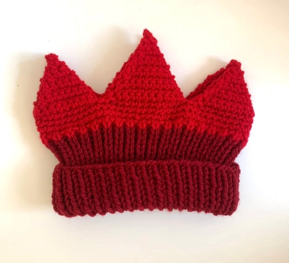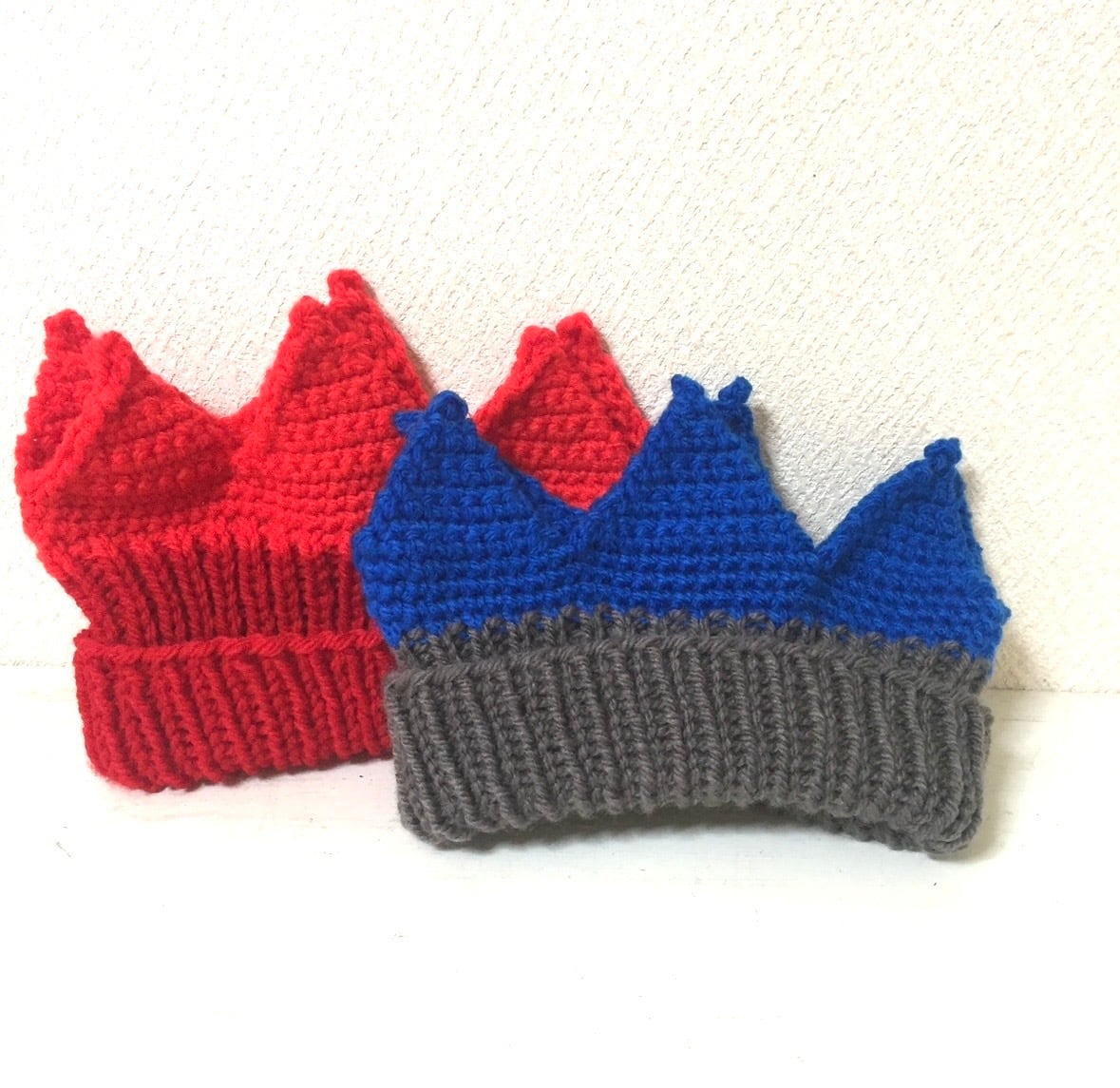 クラウンニットキャップの2色使いデザインです。オーダーいただいてから編みます。ダークレッドとレッド、スチールグレーとブルー、ピンクとホワイトがございます。
